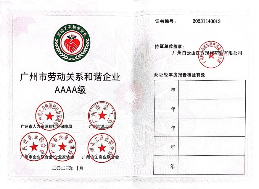 劳动关系和谐单位评审活动由广州市人力资源和社会保障局、广州市总工会、广州市企业联合会/企业家协会、广州市工商业联合会联合开展,白云山汉方公司获评“广州市劳动关系和谐企业AAAA级”荣誉是对企业构建和发展和谐劳动关系、建立创新人才激励机制等工作的充分肯定。