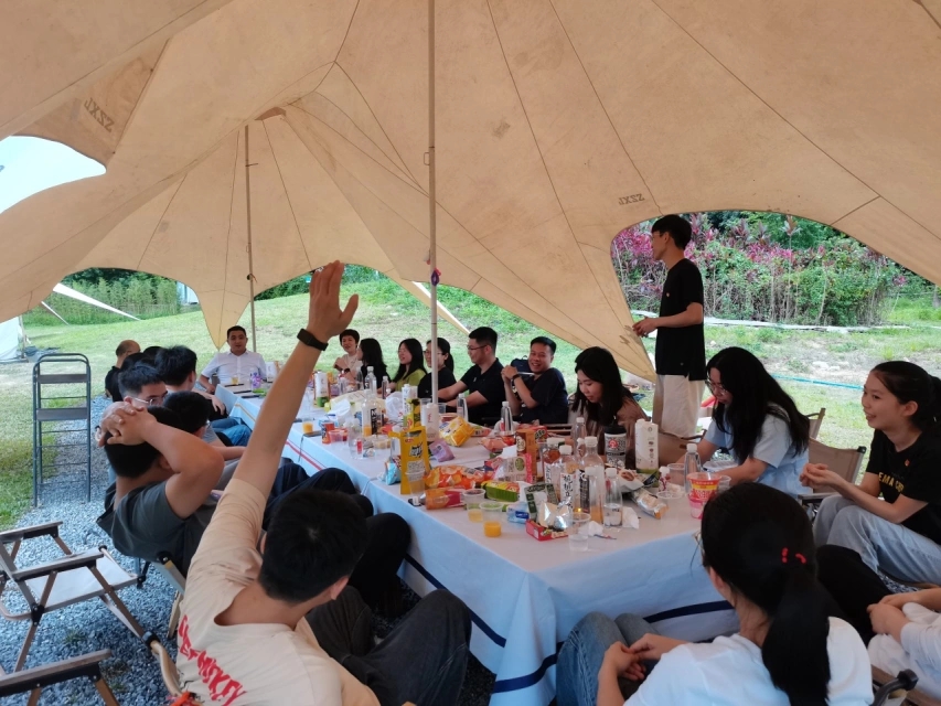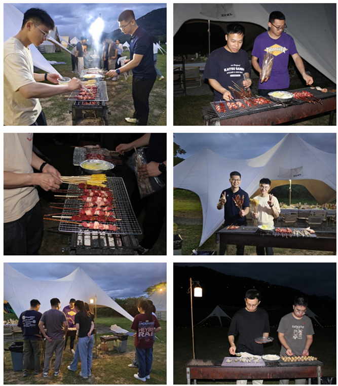 黄昏时分,露营基地传出阵阵香气,团员青年们其乐融融,游刃有余地穿梭在烧烤架和餐桌之间。大家有条不紊、分工明确,有负责烧烤的,有负责加碳的,忙的不亦乐乎。现场欢笑声不断,气氛十分活跃。