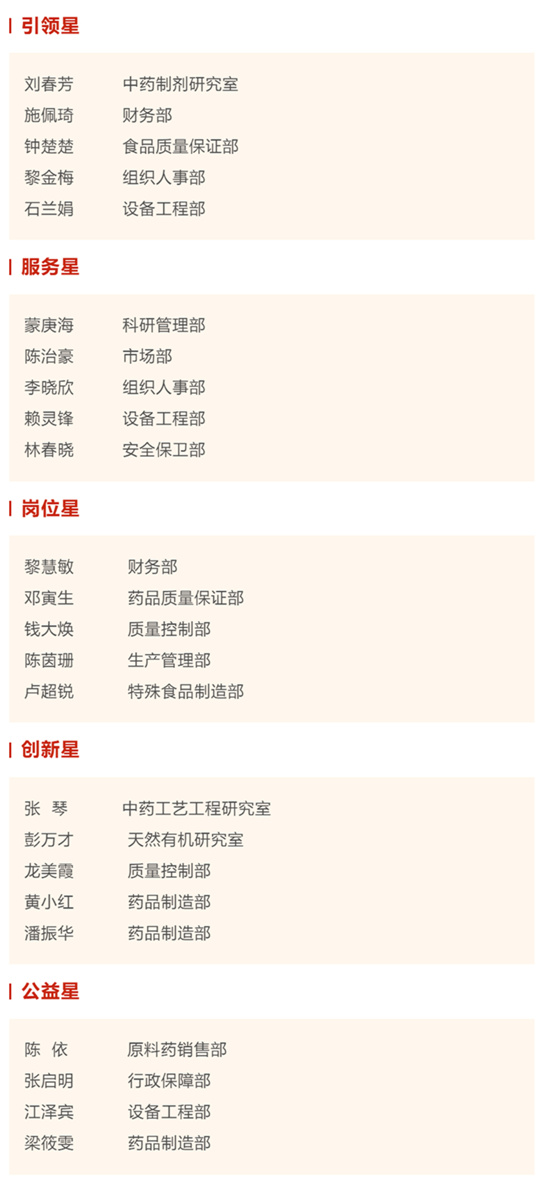 经过宣传发动、基层申报、综合评定、评审定星以及汉方工会委研究,报党委同意,决定授予刘春芳等5名同志引领星称号;授予林春晓等5名同志服务星称号;授予黎慧敏等5名同志岗位星称号;授予张琴等5名同志创新星称号;授予张启明等4名同志公益星称号。