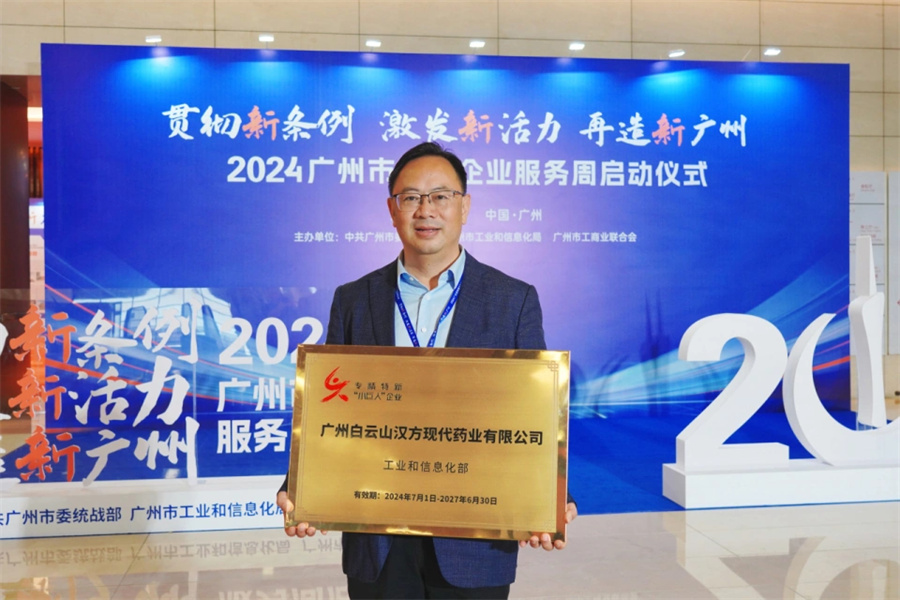 2024年11月1日,由中共广州市委统战部、广州市工业和信息化局、广州市工商业联合会共同主办的2024年广州市企业服务周启动仪式在广州举行。仪式上,广州市委常委、市统战部部长王世彤,广州市副市长江智涛为获得国家级专精特新“小巨人”称号的广州市企业颁牌,白云山汉方党委书记、董事长袁诚作为企业代表上台受牌。
