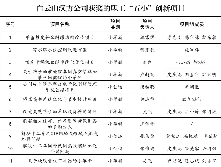 经项目评审会综合评定,最终评选出汉方公司获奖的职工“五小”创新项目共11个(详见下表),累计为公司创造经济效益节约成本共53.53万元。此外,张伟健、王伟珍等8位职工被评为“季度之星”。